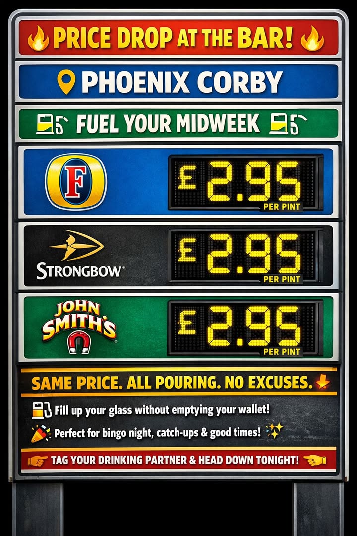 👉PRICE DROP AT THE BAR! 🔥 📍 Phoenix Corby ⛽ FUEL YOUR MIDWEEK ⛽ 🍺 Fosters – £2.95 🍓 Strongbow – £2.95 🍺 John Smith’s – £2.95 💥 SAME PRICE. ALL POURING. NO EXCUSES. 💥 🚨 Fill up your glass without emptying your wallet! 🎉 Perfect for bingo night, catch-ups & good times 👇 Tag your drinking partner & head down tonight!